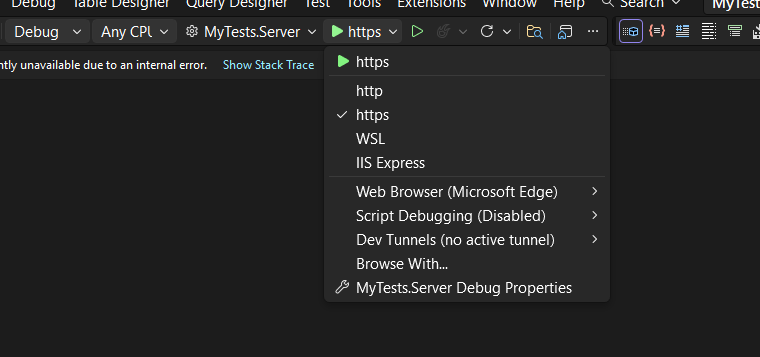 You’ll notice several run options — I recommend using the HTTPS version instead of IIS Express (I stopped using IIS Express because it doesn’t work well on ARM-based computers).